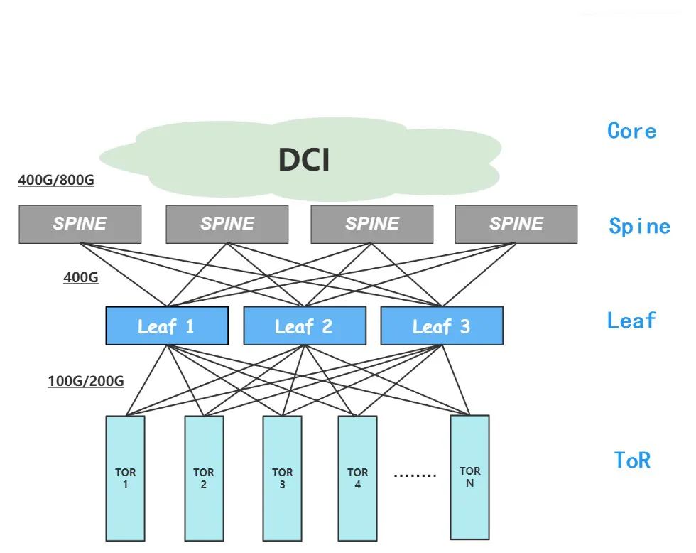 数据枢纽组网示意图(典型的三级CLOS组网)