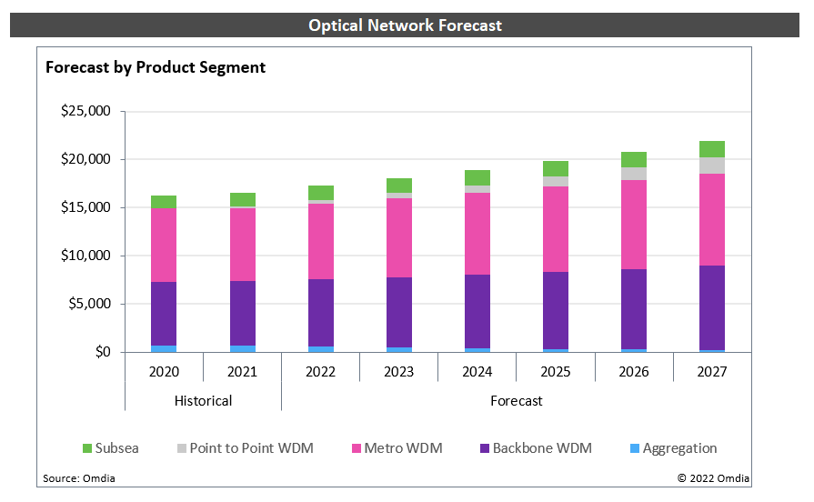 Dell'Oro预测,骨干网DWDM的收入在未来5年将以5%的CAGR增长,同期城域网WDM的收入将以3%的CAGR增长。与此同时,另一家咨询机构Omdia的分析师称,到2026年,城域网WDM市场将超过90亿美元,如下图所示。